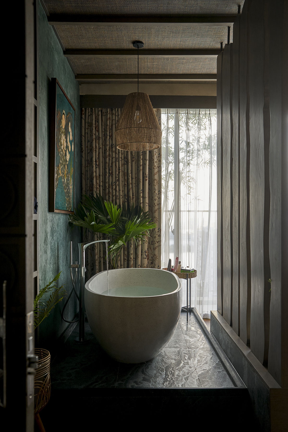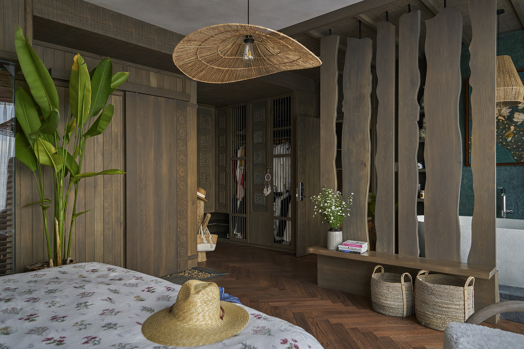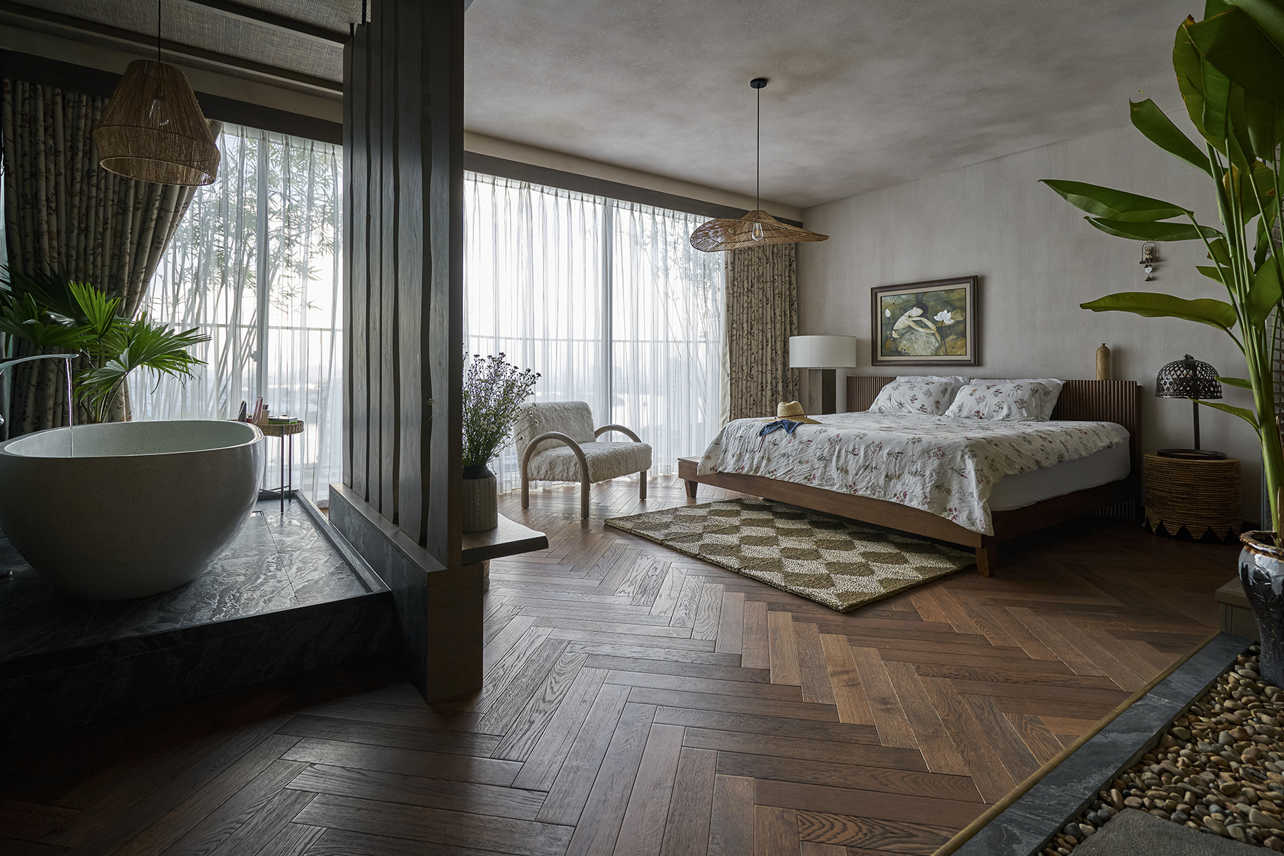 Căn hộ được thiết kế theo phong cách nhiệt đới, con người và thiên nhiên cùng chia sẻ một không gian thở. Ở phong cách này, màu sắc và họa tiết nội thất lấy cảm hứng từ một hòn đảo thanh bình, ngợp sắc xanh và không khí trong lành.