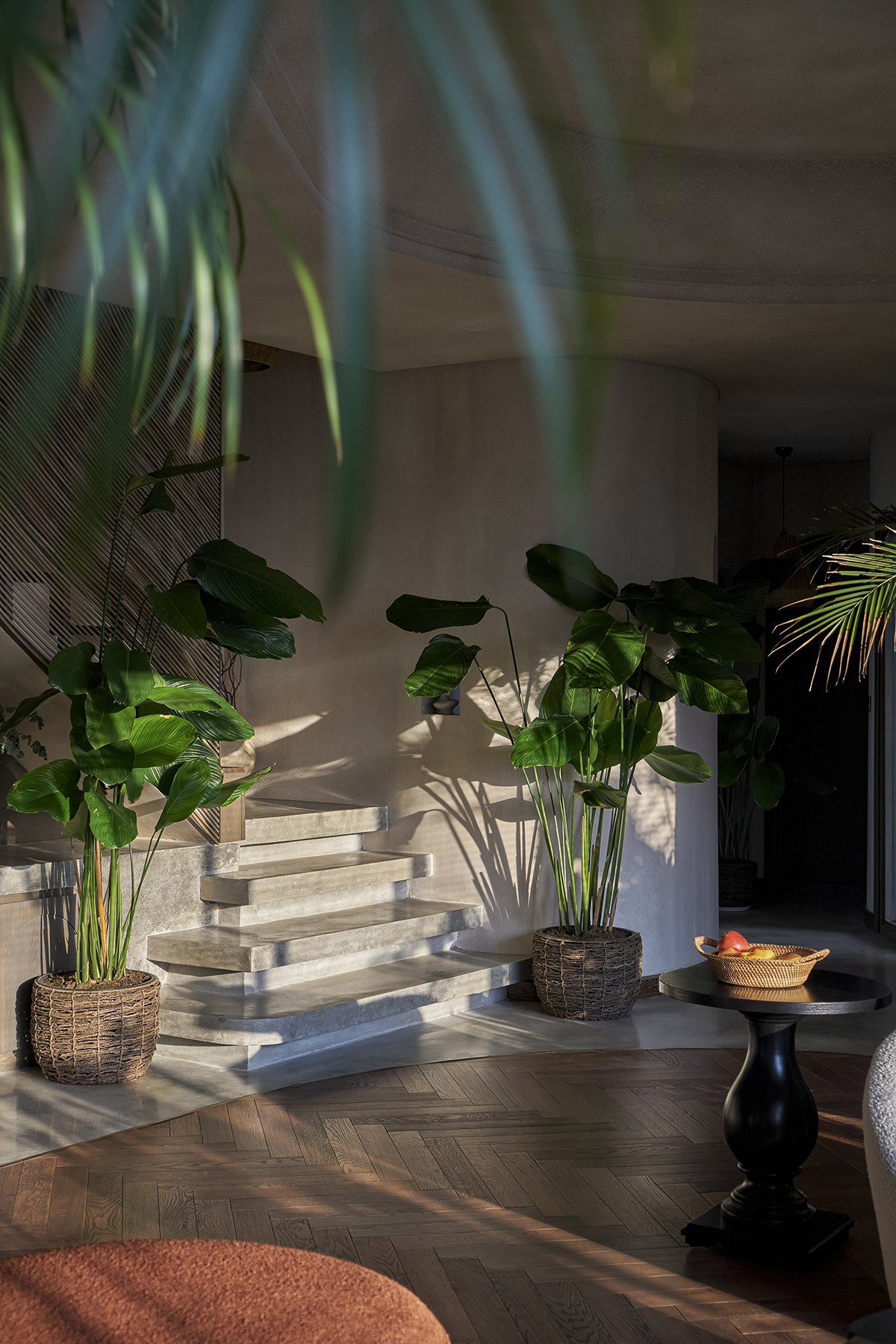 Để thúc đẩy sự tương tác giữa con người và thiên nhiên, những vật liệu thân thiện với môi trường như bê tông, đá mài... và vật liệu thủ công như mây, tre… đã được sử dụng làm nội thất.