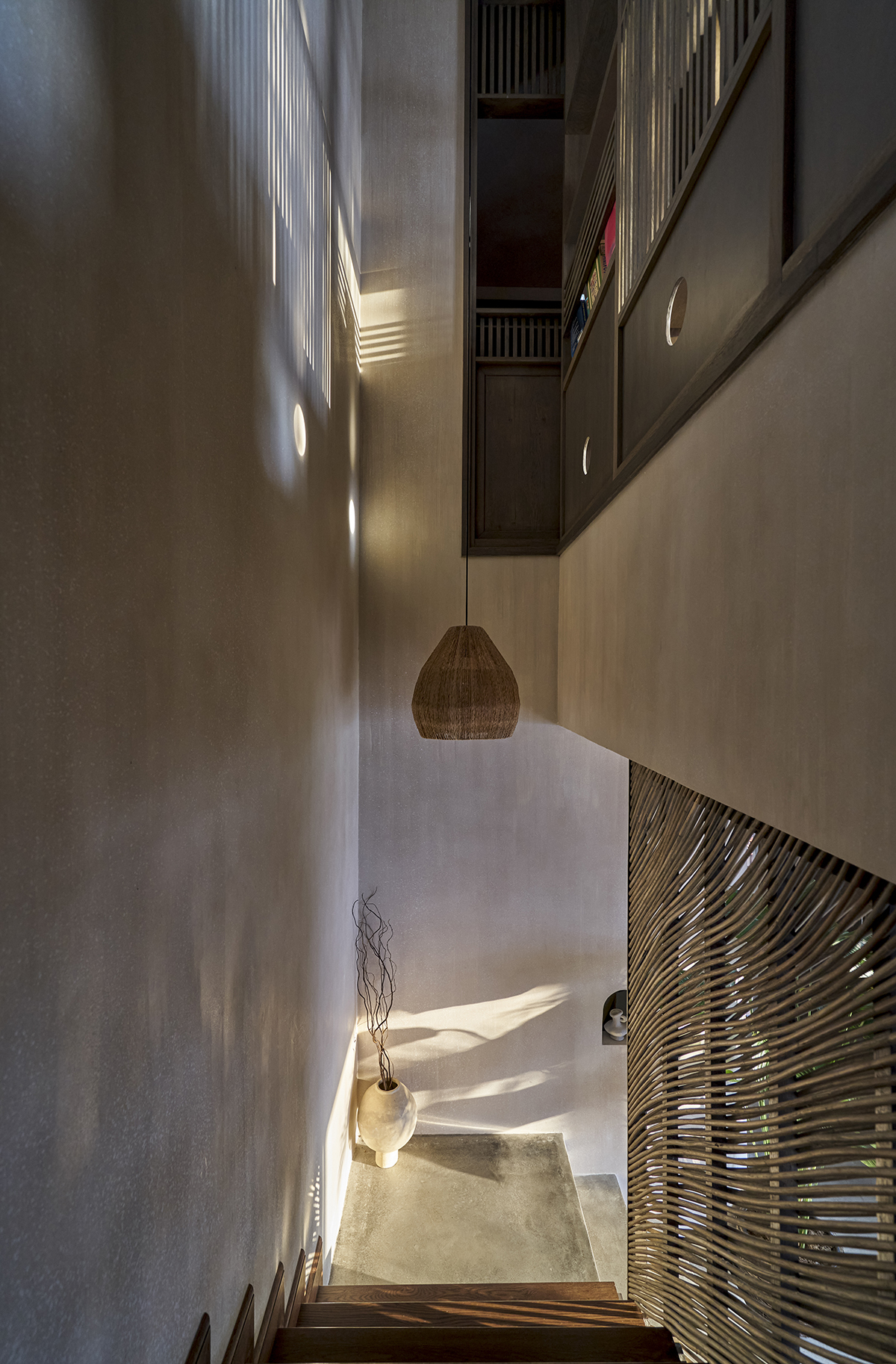 Ngoài sử dụng màu sơn tường là màu mưa (màu kem pha xám, nâu), kiến trúc sư còn tạo độ xước không đều trên bề mặt tường để tạo cảm giác giống những cơn mưa trong rừng nhiệt đới.
