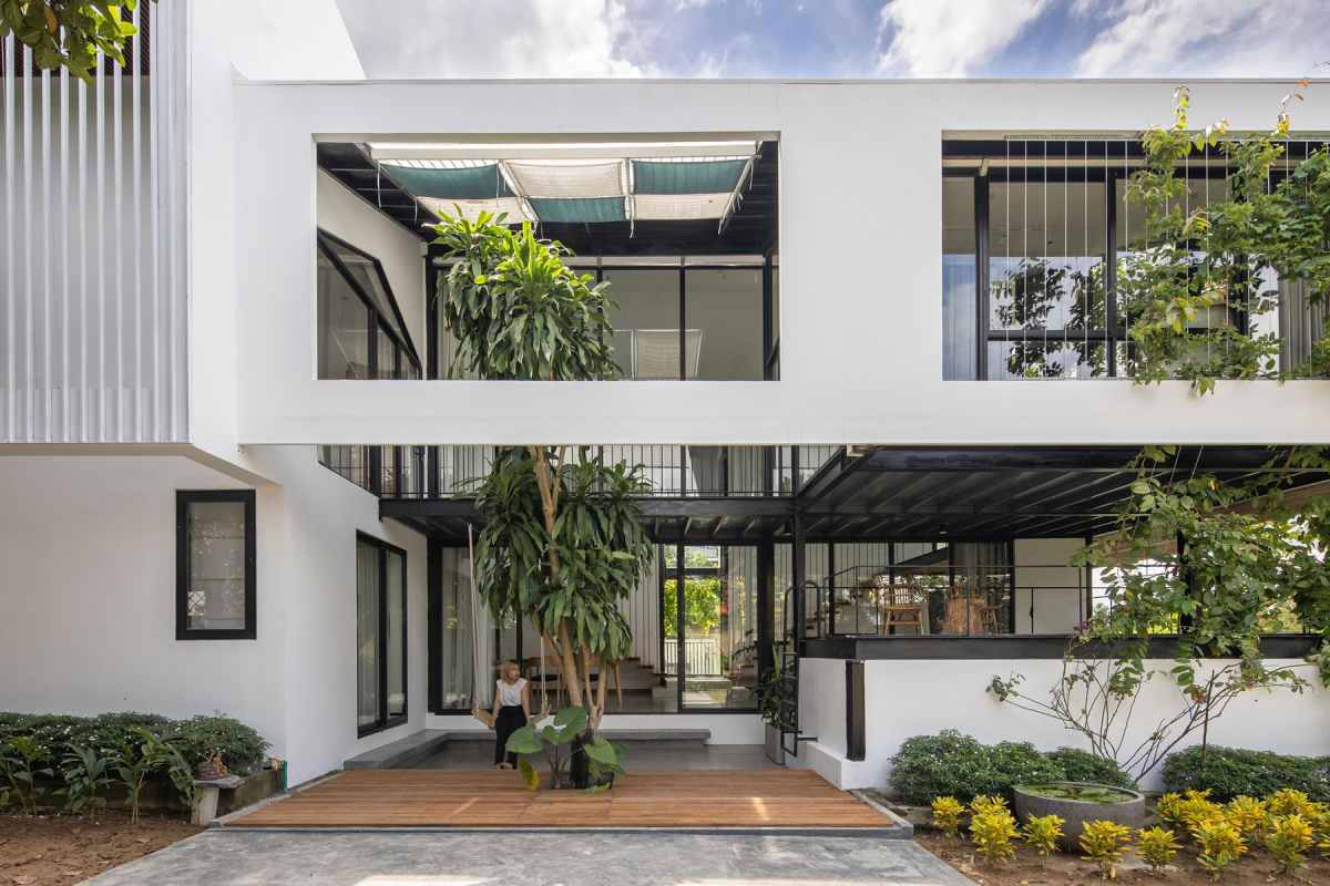 Các không gian được kết nối bằng một chuỗi liên kết giữa cầu thang, hành lang, sân trong từ tầng một lên tầng hai, bao quanh lõi thông tầng nằm ở trung tâm nhà. Khoảng thông tầng lớn tạo đối lưu không khí làm mát và mở rộng góc nhìn từ trong nhà ra phía chân đồi.