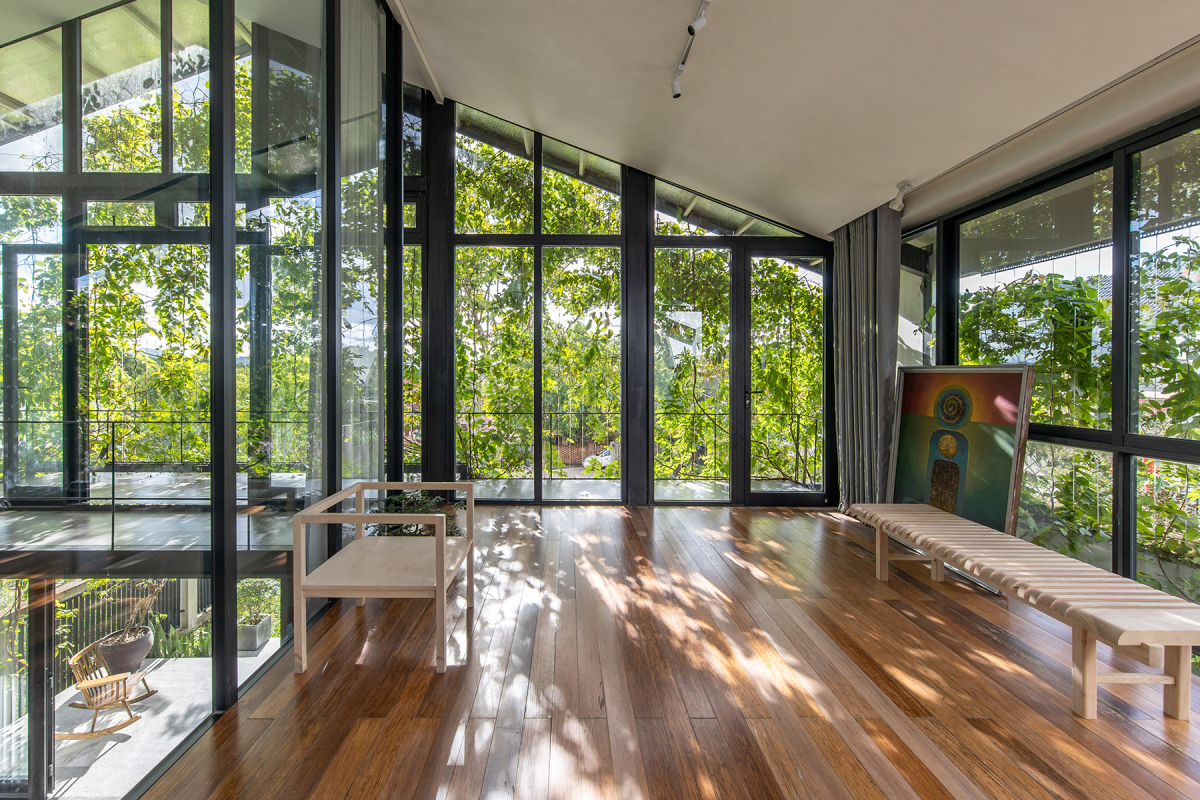 Những tấm kính bọc bên ngoài cho phép người trong nhà tiếp cận thiên nhiên dễ dàng, đồng thời không bị ảnh hưởng quá nhiều bởi sự ồn ã bên ngoài do cách âm tốt.