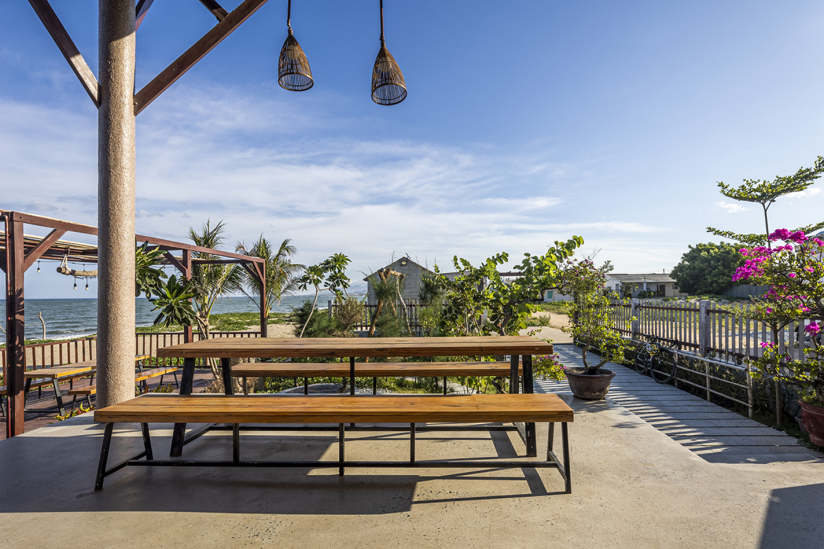 Vì nhà sát biển, gió và hơi muối khiến cây trồng khó phát triển nên gia chủ chọn những loại cây dễ sống như hoa giấy, xương rồng, phi lao, dừa... cho hệ thống sân vườn. Ngoài thiết kế thoáng mát, cây xanh xung quanh nhà mang lại không gian yên tĩnh và thư giãn lý tưởng cho mọi người.