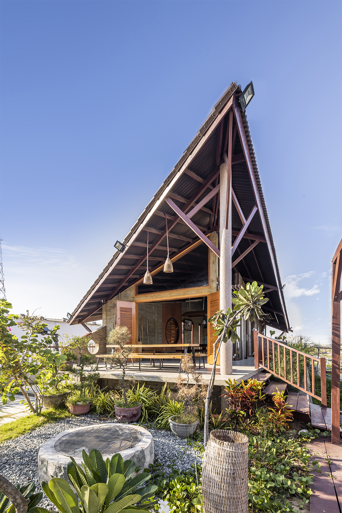 Từ hướng biển, mái nhà trông như cánh buồm căng tràn sức gió khi ra khơi. Nếu nhìn hướng xéo từ khu đốt lửa trại phía ngoài sân, mái nhà lại giống cánh diều hình thoi.