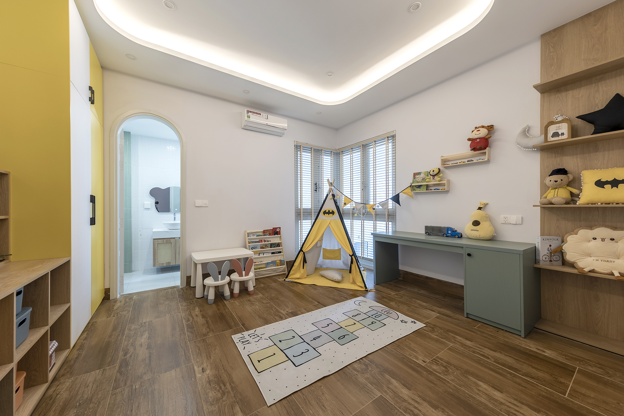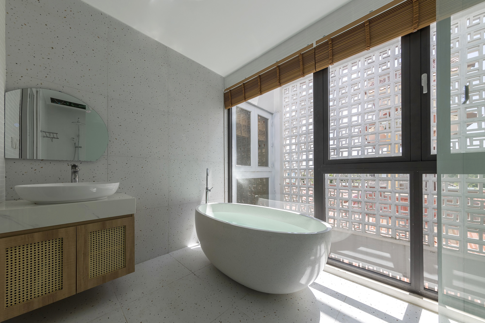 Ngoài các phòng ngủ, phòng thay đổ, hai phòng vệ sinh cũng luôn tràn ngập ánh sáng tự nhiên và thông thoáng nhờ hệ cửa kính lớn. Khoảng không gian đệm giữa cửa kính và hàng rào gạch ở bên ngoài cũng đóng vai trò cản bức xạ nhiệt, giúp căn phòng luôn mát mẻ.