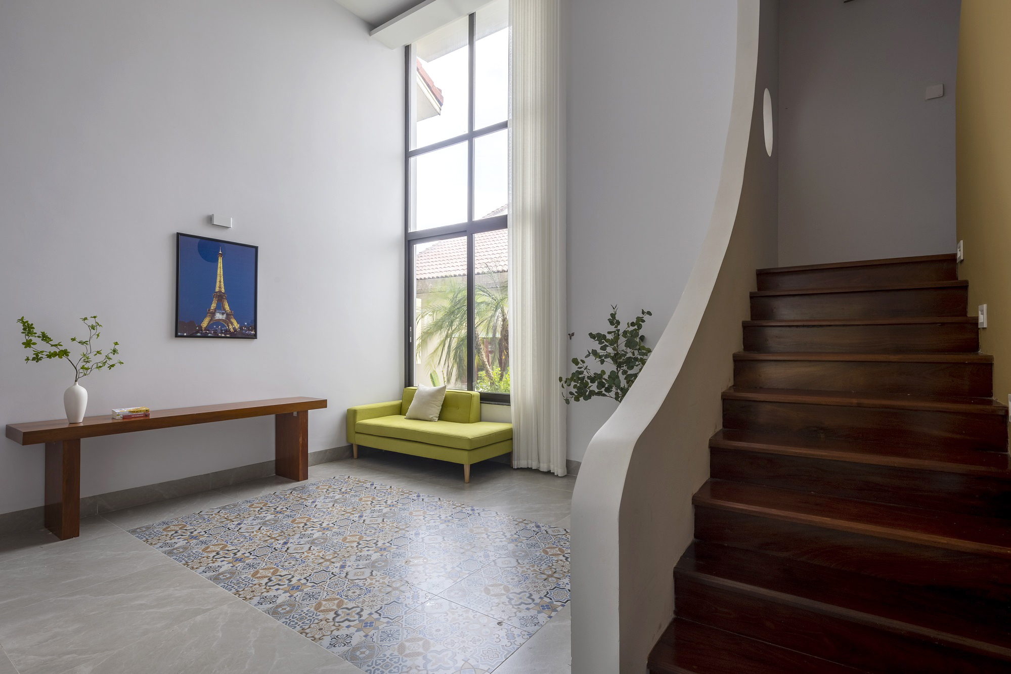 Khu vực cửa ra vào tầng một được xây lùi để tránh nắng.