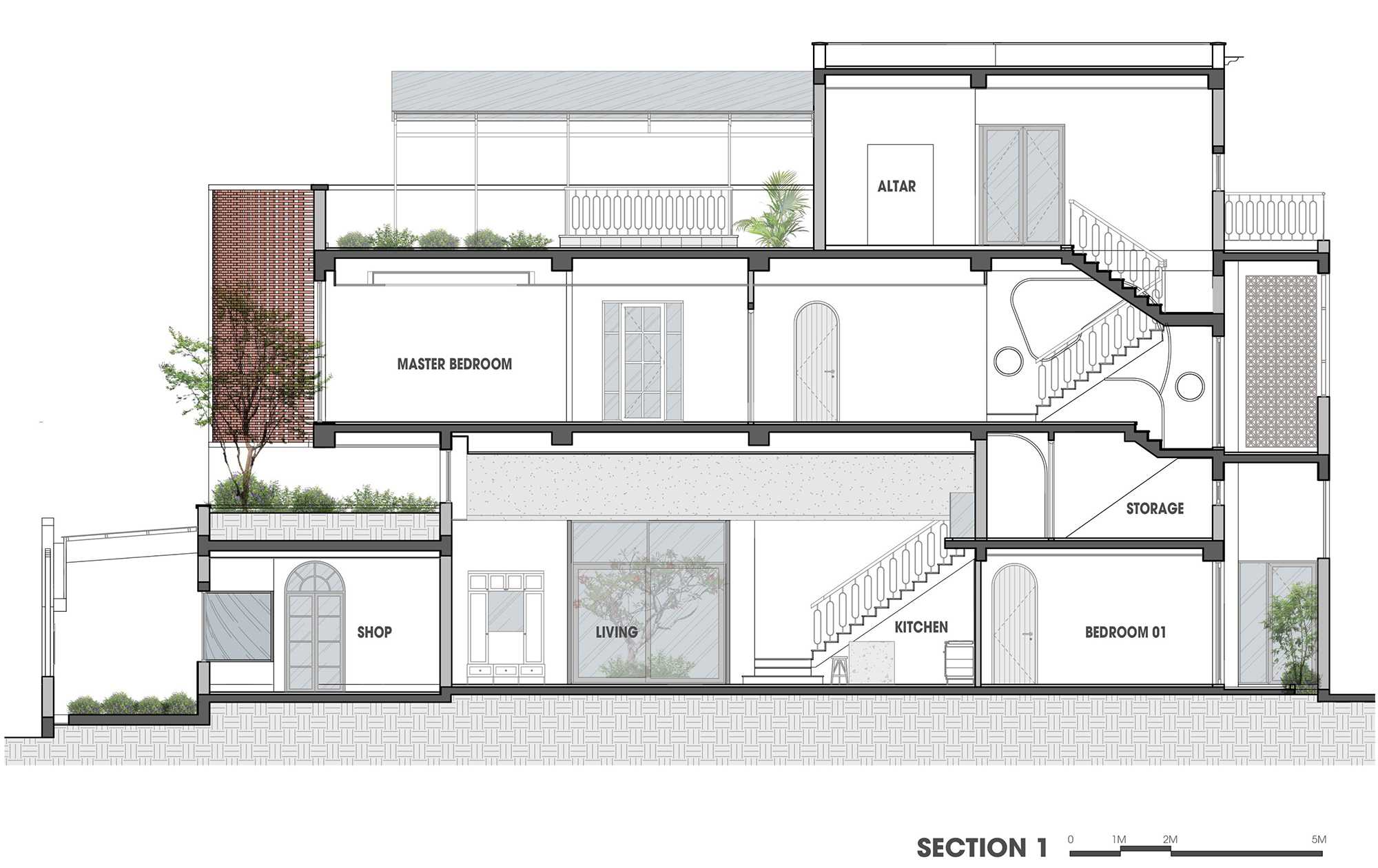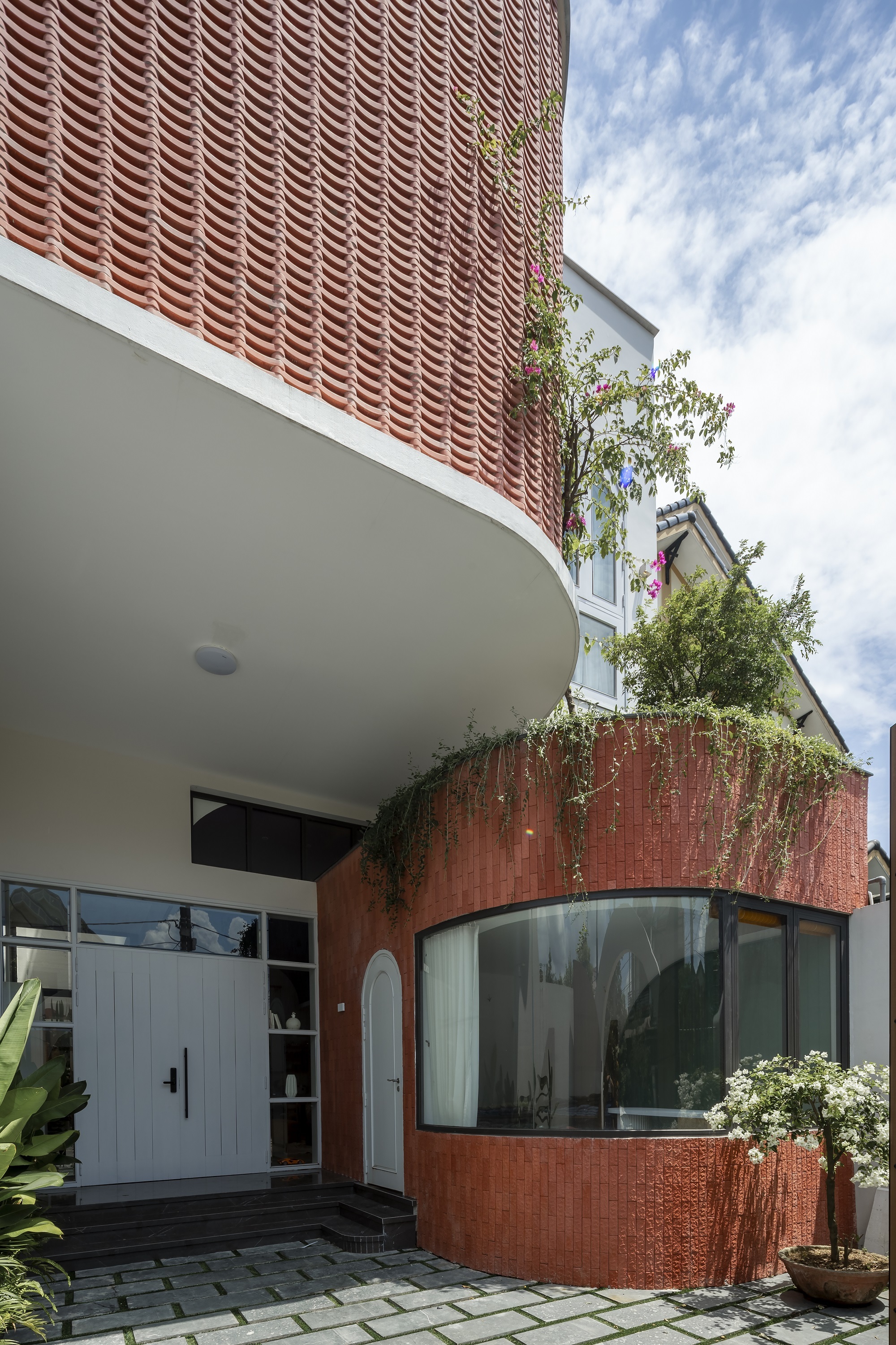Ngoài để ở, chủ nhà mong muốn đặt một studio thời trang 18 m2 ở sảnh đón dưới tầng một. Kiến trúc sư đã đưa ra giải pháp kết hợp các đường cong mềm mại của kiến trúc, cây xanh trên mái, lớp vỏ ngoài làm từ gạch đỏ để tạo nên mặt tiền ngoại thất ấn tượng, có chiều sâu, phục vụ cho việc kinh doanh của gia chủ.