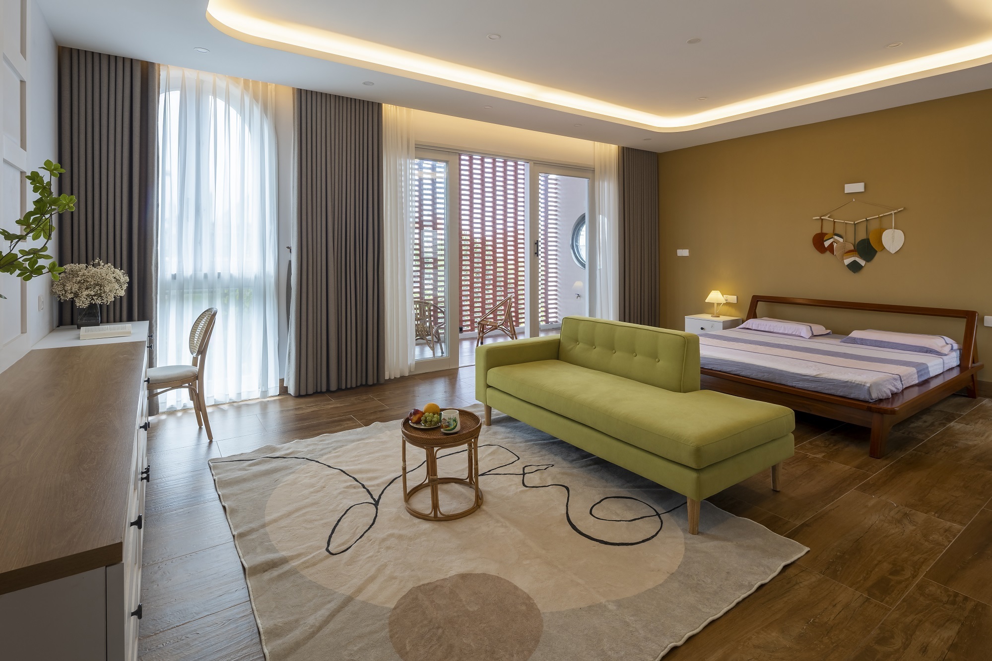 Phòng ngủ chính với cửa sổ nhìn ra ngoài sân vườn phía trước và khoảng thông tầng phía sau. Nhờ bức tường gạch bao bọc nên căn phòng tránh được ánh nắng trực tiếp, nhưng vẫn đủ sáng và thông thoáng.