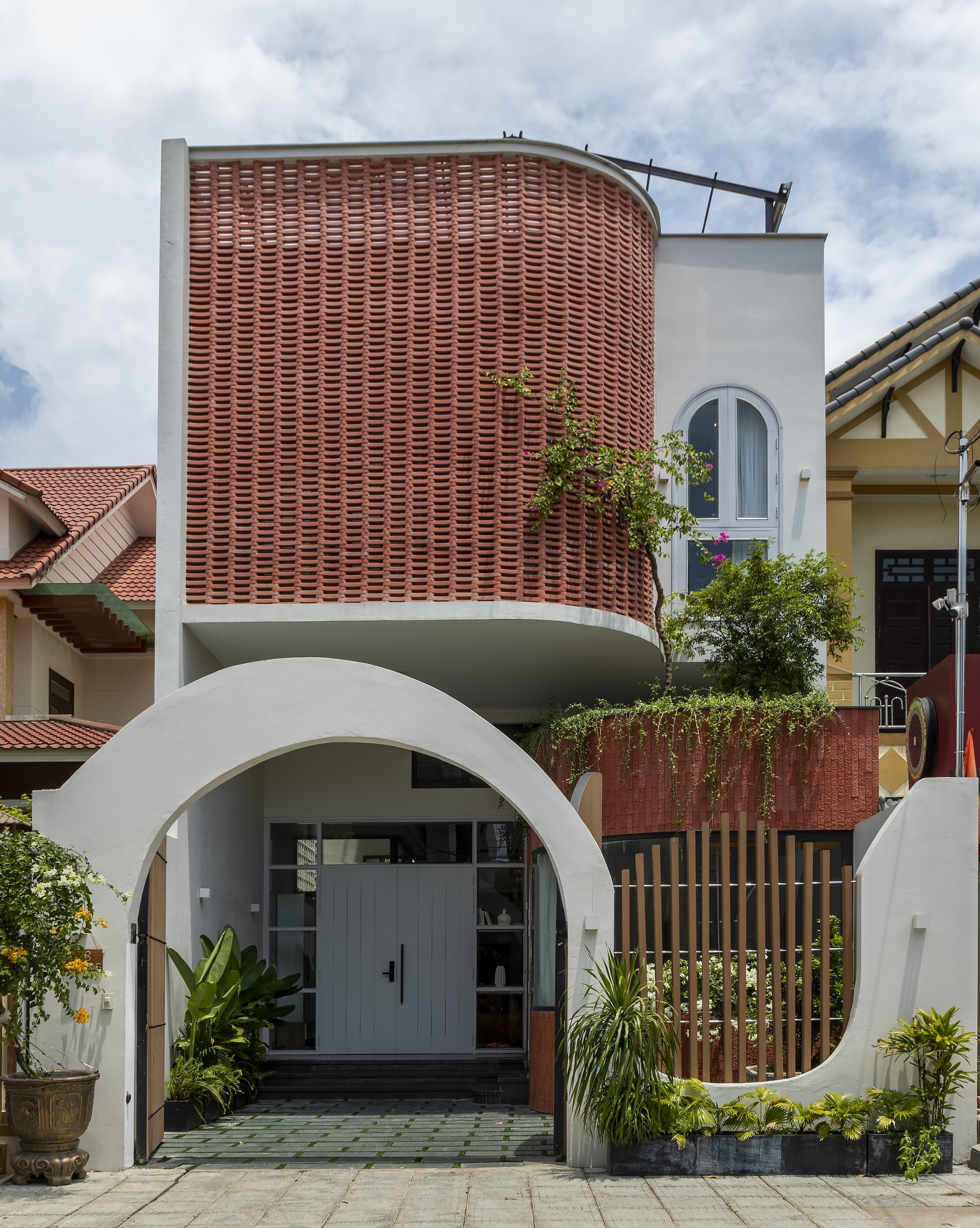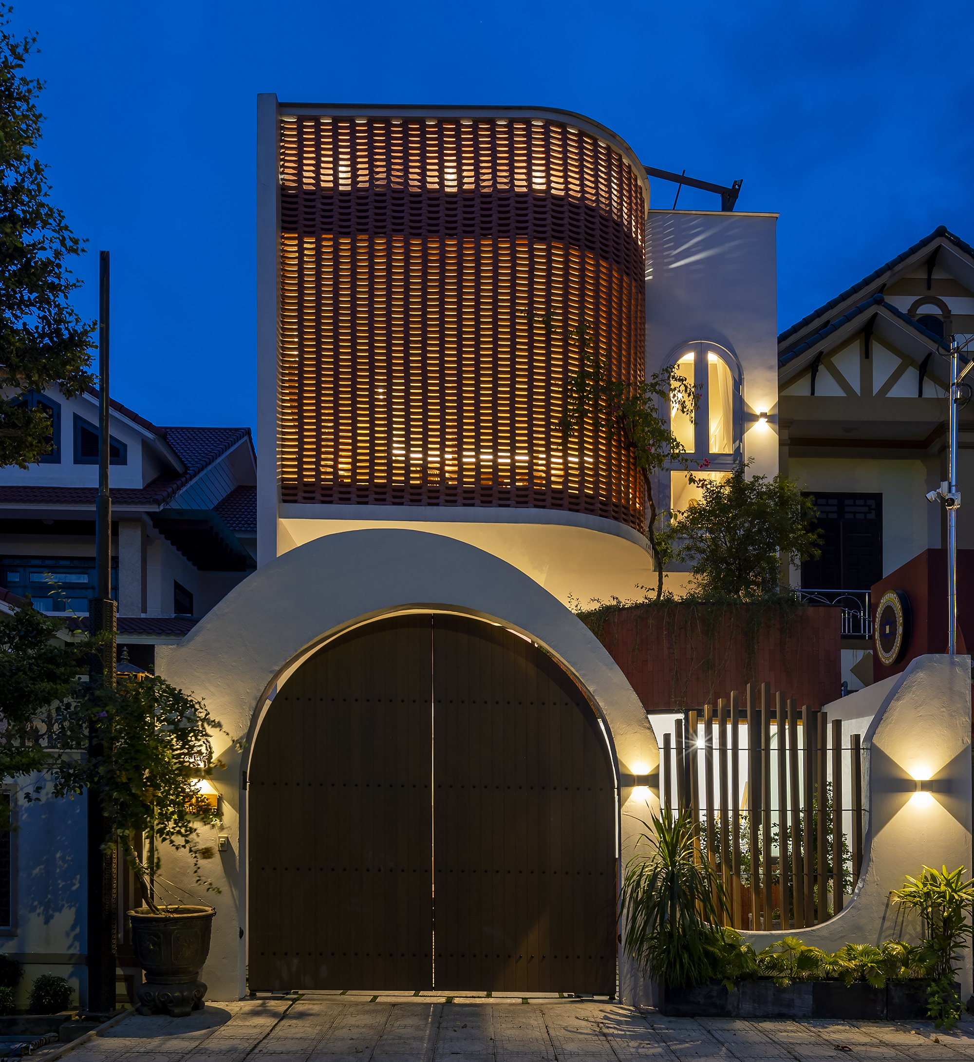 Ngôi nhà được xây trên diện tích 182 m2 tại Đông Hà (Quảng Trị) - nơi có thời tiết thay đổi rõ rệt theo mùa: trời lạnh, mưa kéo dài khi vào đông và có gió nóng, khô trong mùa hè. Để làm hài hòa yếu tố khí hậu, nhóm kiến trúc sư đã thiết kế một bức tường gạch ở mặt tiền, có tác dụng như lớp "áo" bao bọc, giảm bức xạ ánh sáng, tạo không gian riêng tư cho ban công phòng ngủ.