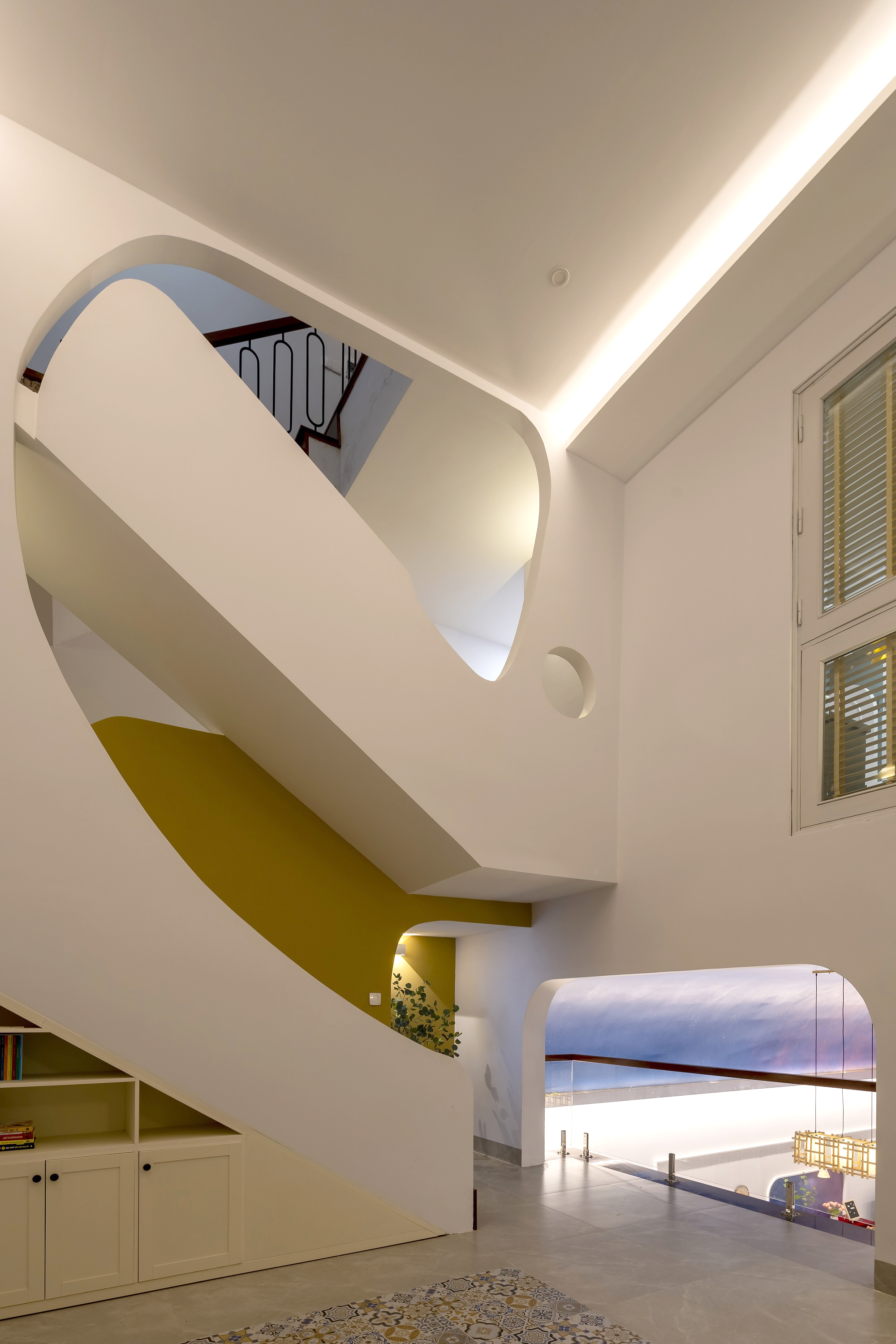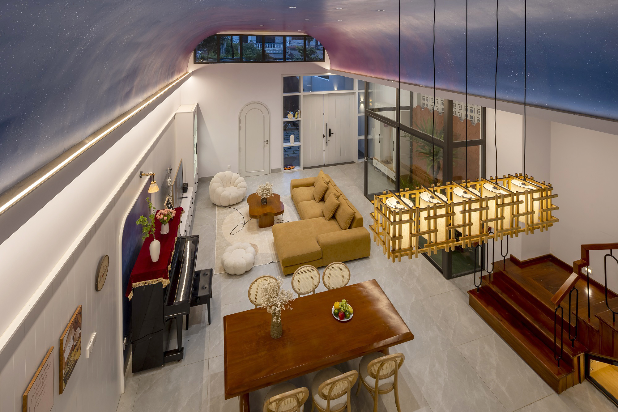 Phòng khách, phòng ăn và bếp đặt trên một mặt sàn tầng một. Trần được nâng cao, uốn cong, phối màu như bầu trời. Ánh sáng và không khí tự nhiên chủ yếu lấy từ giếng trời và cửa sổ trên cao, tạo điều kiện giúp cây xanh phát triển tốt, điều hòa không khí, giúp ngôi nhà ấm áp trong mùa đông và mát mẻ khi vào hè.
