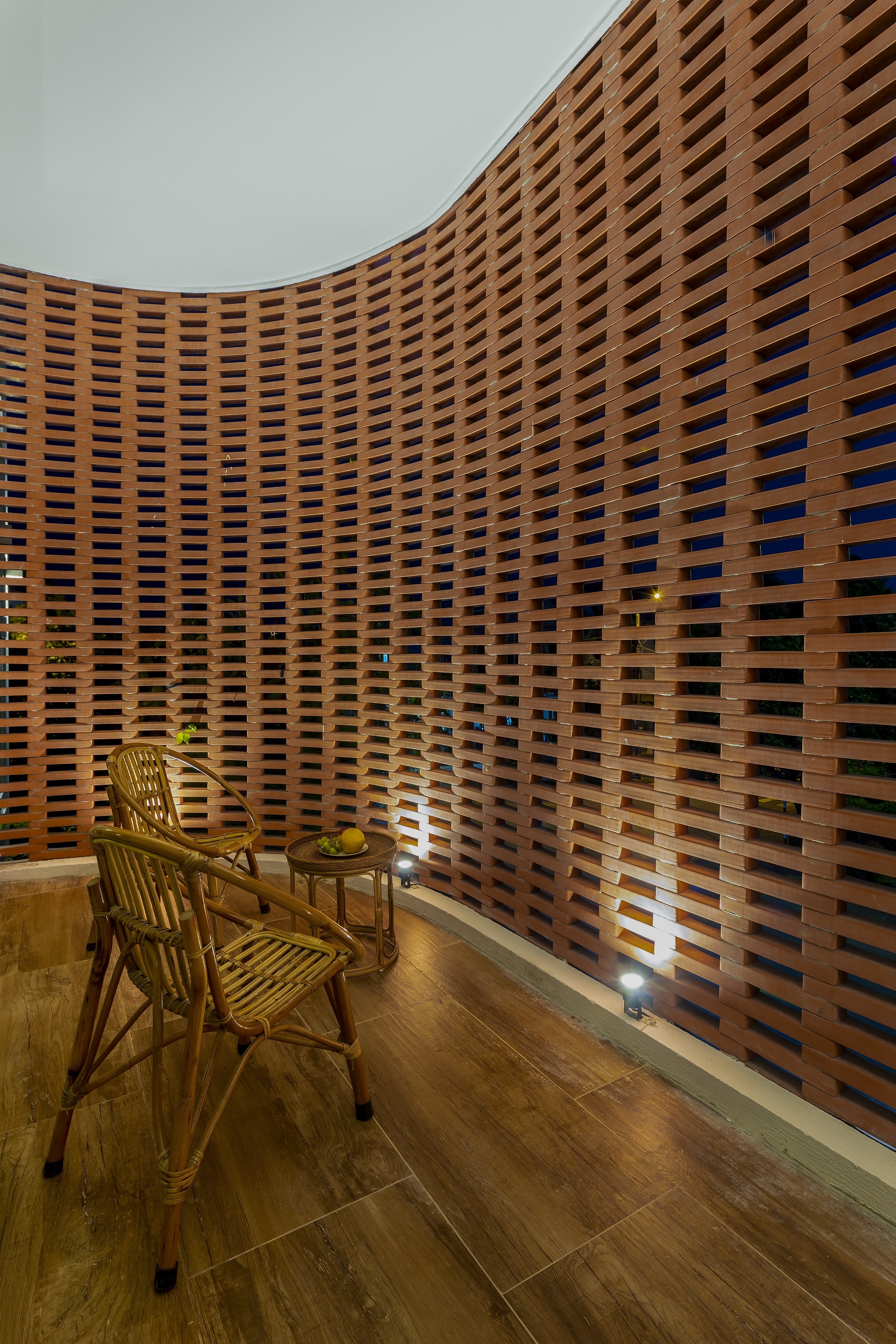 Toàn bộ ban công tầng hai được bao bọc bởi lớp gạch đỏ ở mặt tiền, như một khoảng không gian đệm tránh nắng gió cho phòng ngủ chính. Đây cũng là không gian nghỉ ngơi mỗi tối, nơi gia chủ có thể hướng tầm nhìn ra khung cảnh phía trước nhà.