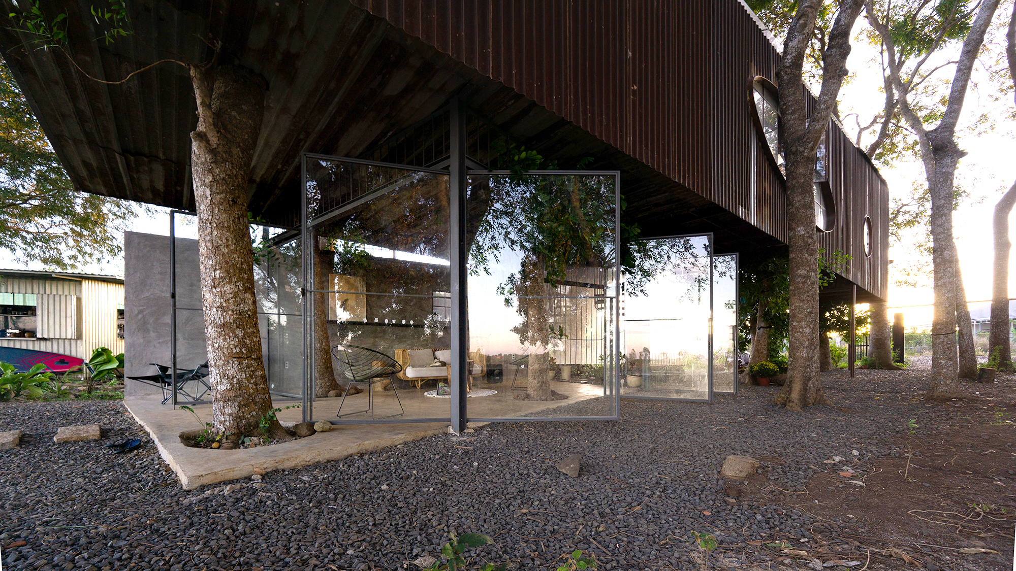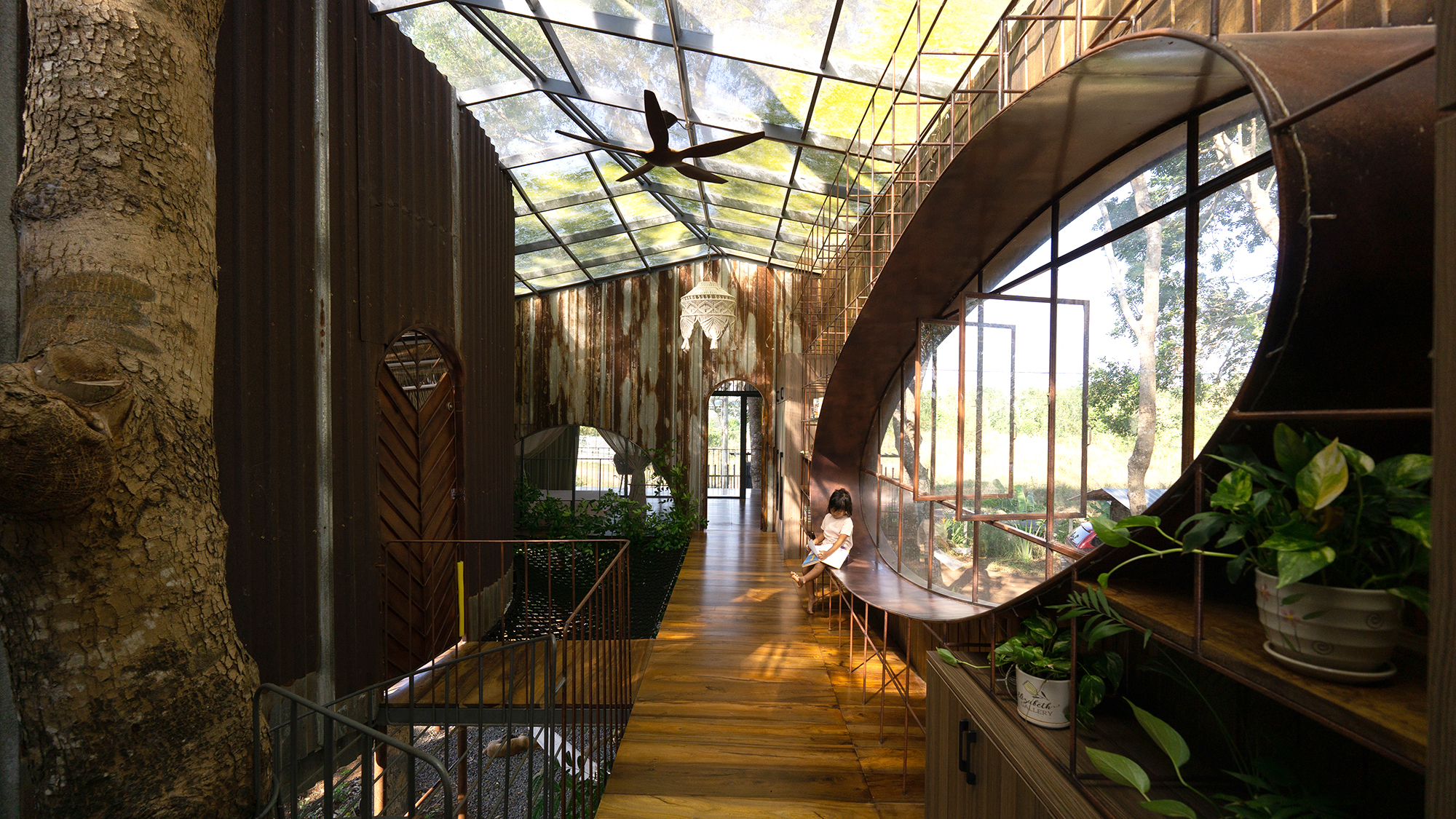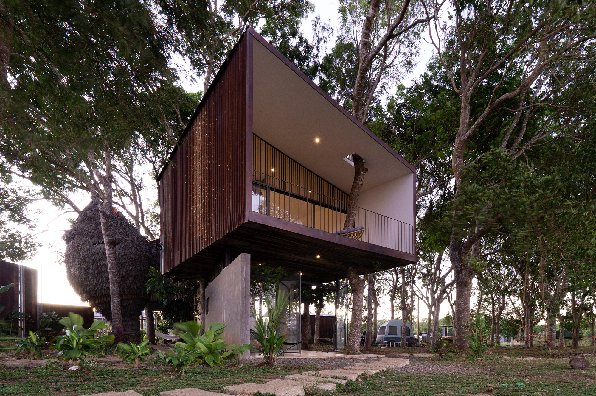 Nhóm kiến trúc sư đã đưa ra giải pháp xây dựng một ngôi nhà trên cây, lấy cảm hứng từ căn chòi lá tuổi thơ. Công trình có kết cấu khung sắt thép, tường bao bằng tôn đã qua sử dụng, được đưa lên cao khỏi mặt đất và nương tựa vào những thân cây xà cừ.