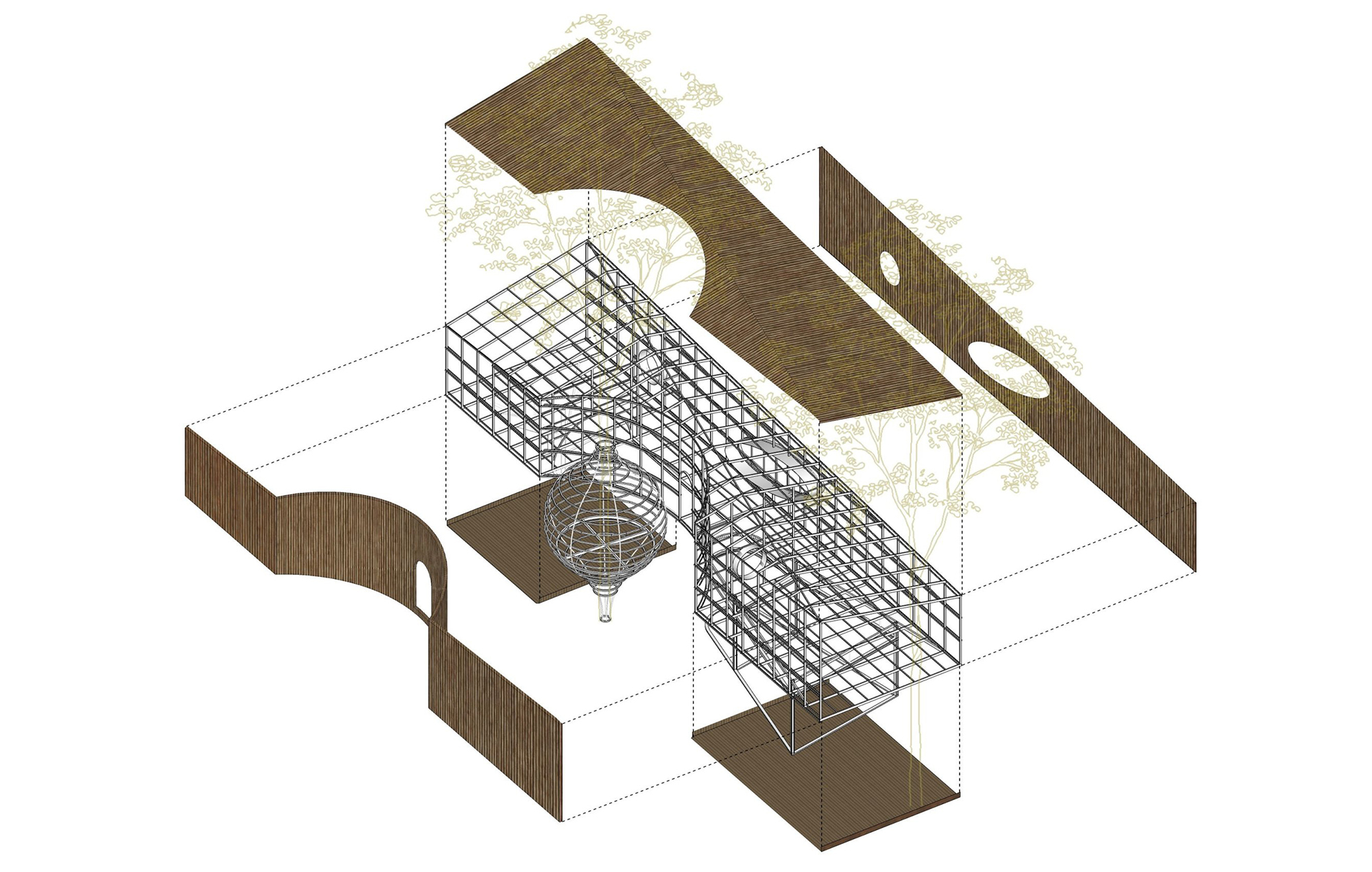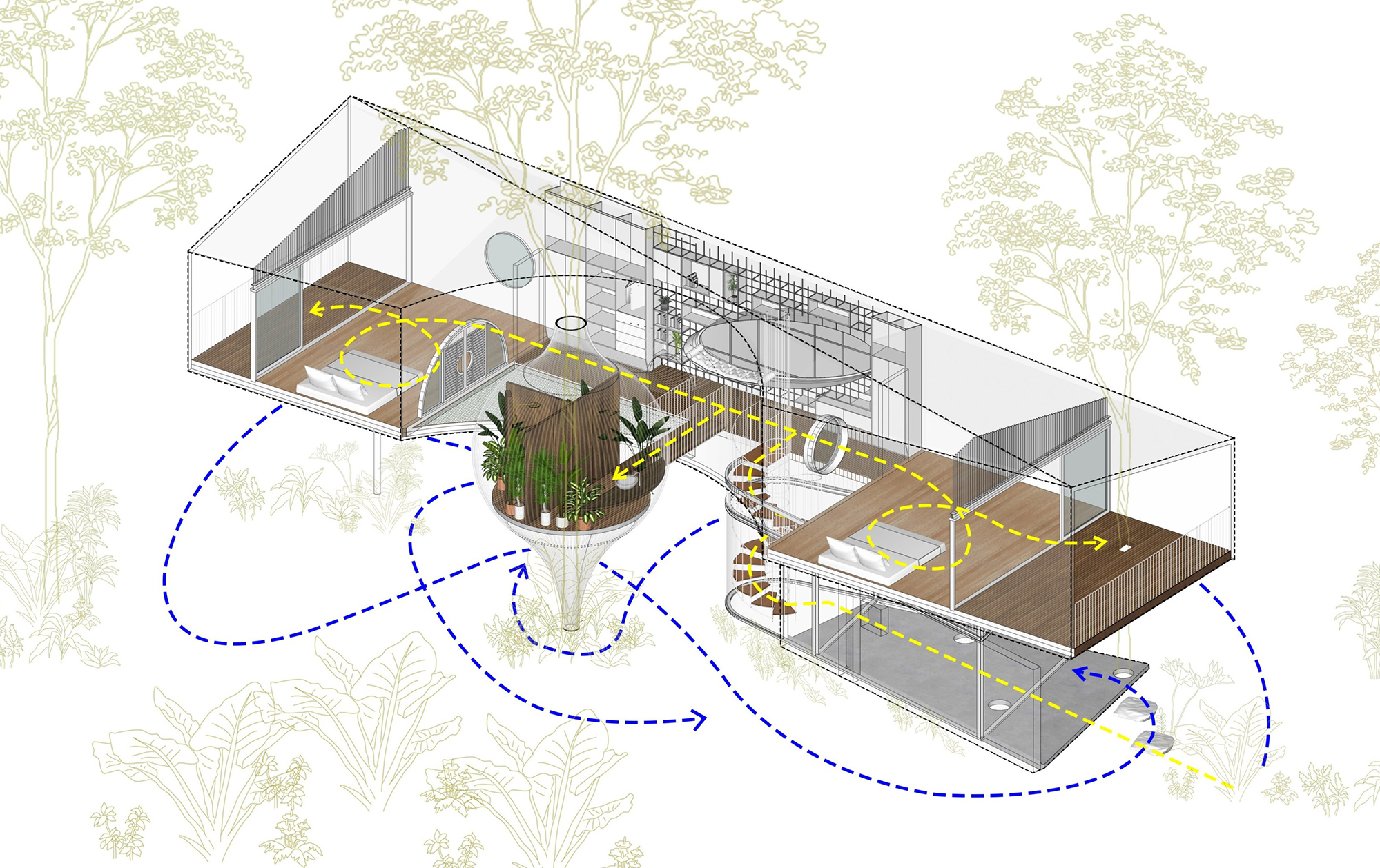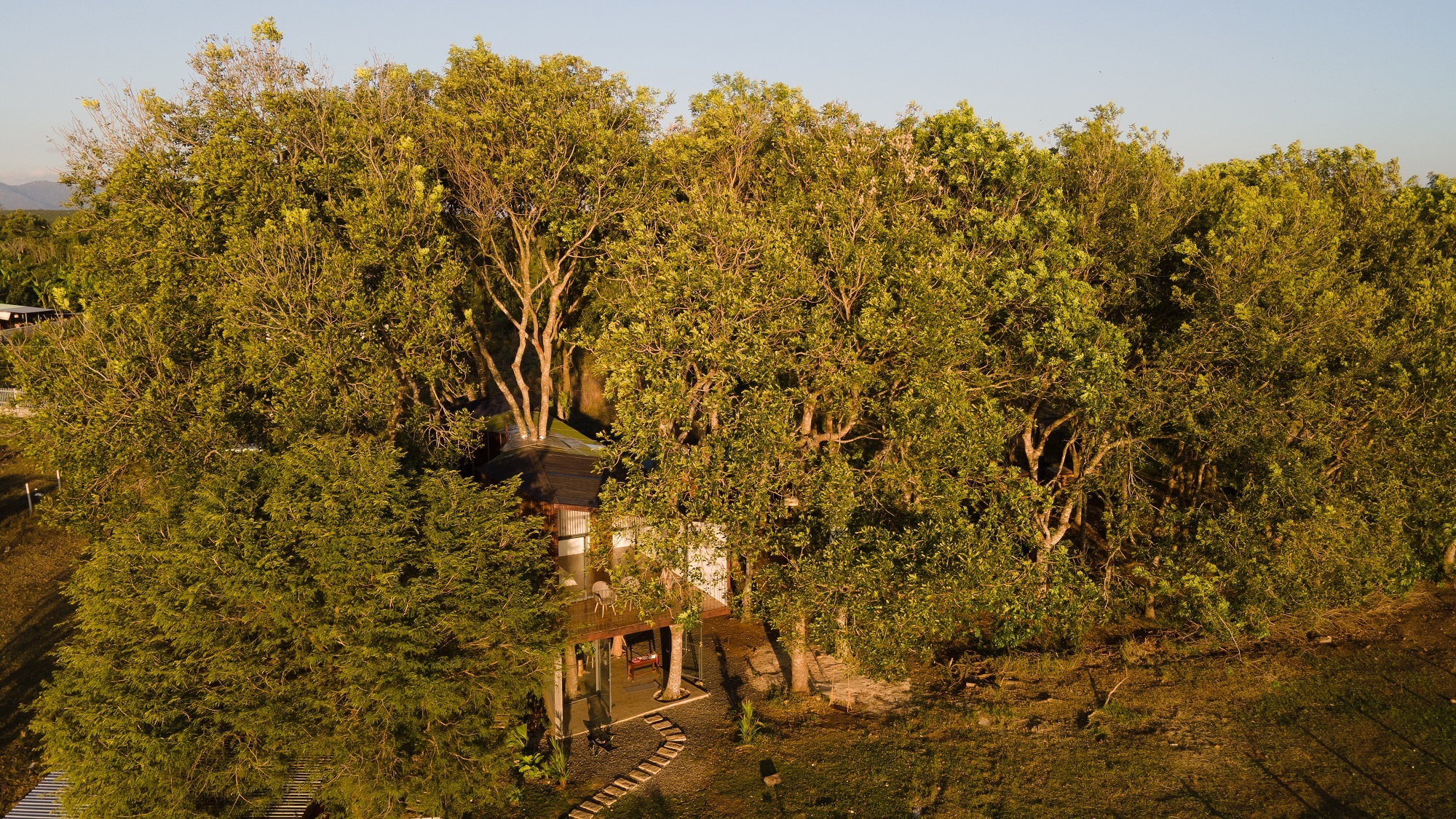 Nhóm kiến trúc sư đã đưa ra giải pháp xây dựng một ngôi nhà trên cây, lấy cảm hứng từ căn chòi lá tuổi thơ. Công trình có kết cấu khung sắt thép, tường bao bằng tôn đã qua sử dụng, được đưa lên cao khỏi mặt đất và nương tựa vào những thân cây xà cừ.
