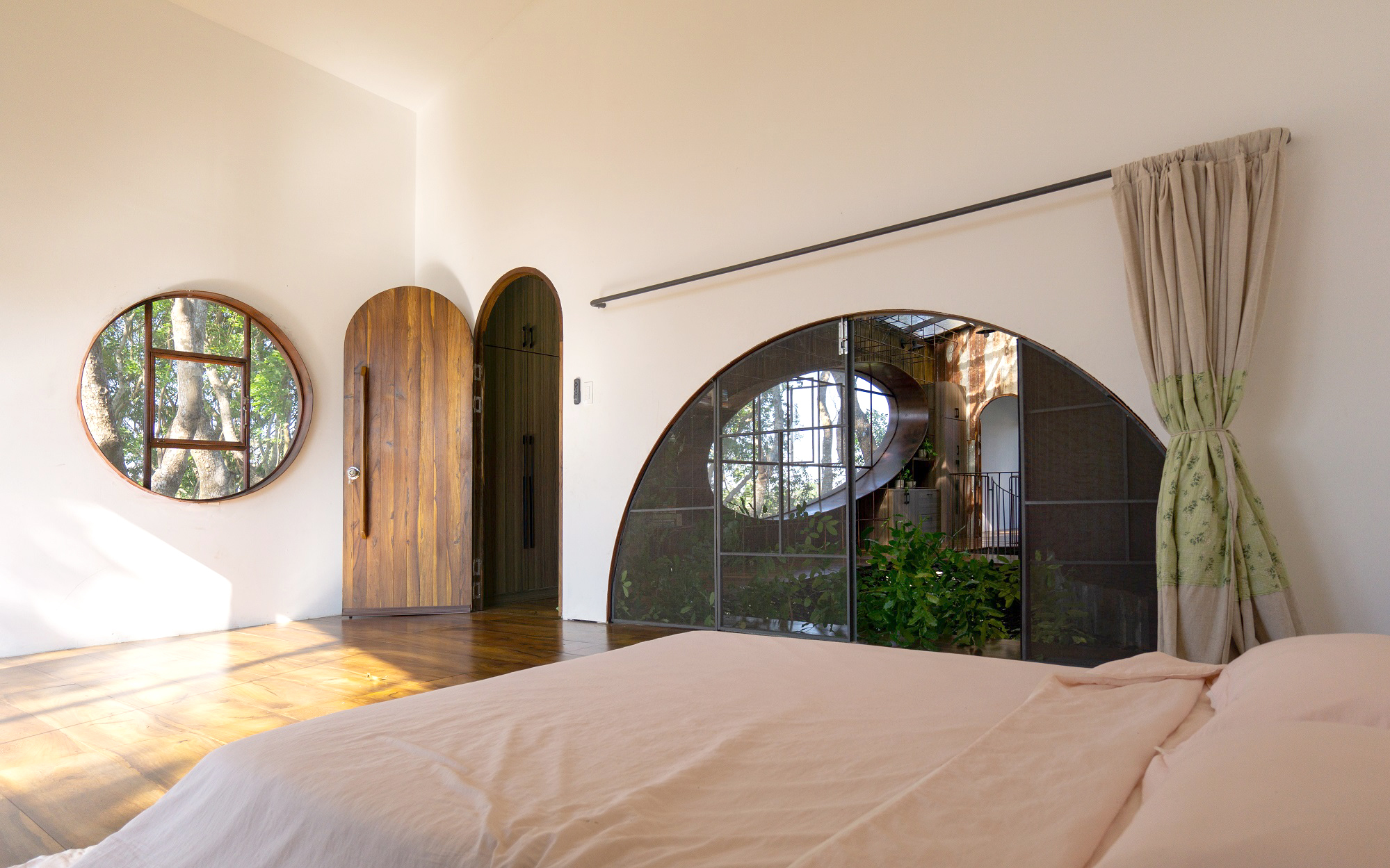 Phòng ngủ được tối ưu nguồn sáng và thông gió. Hệ cửa ra vào và cửa sổ luôn rộng mở nhưng không có cảm giác oi bức vì có những tán cây che mát.