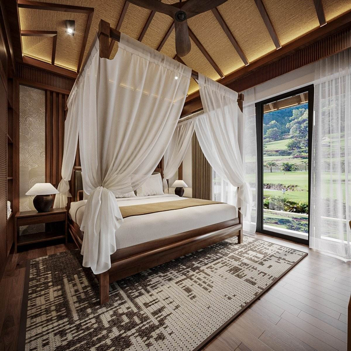 Phòng ngủ sang trọng, tinh tế. Một bên tiếp giáp với thiên nhiên được dùng kính lớn để mở rộng tầm nhìn, đón trọn ánh sáng vào nhà.