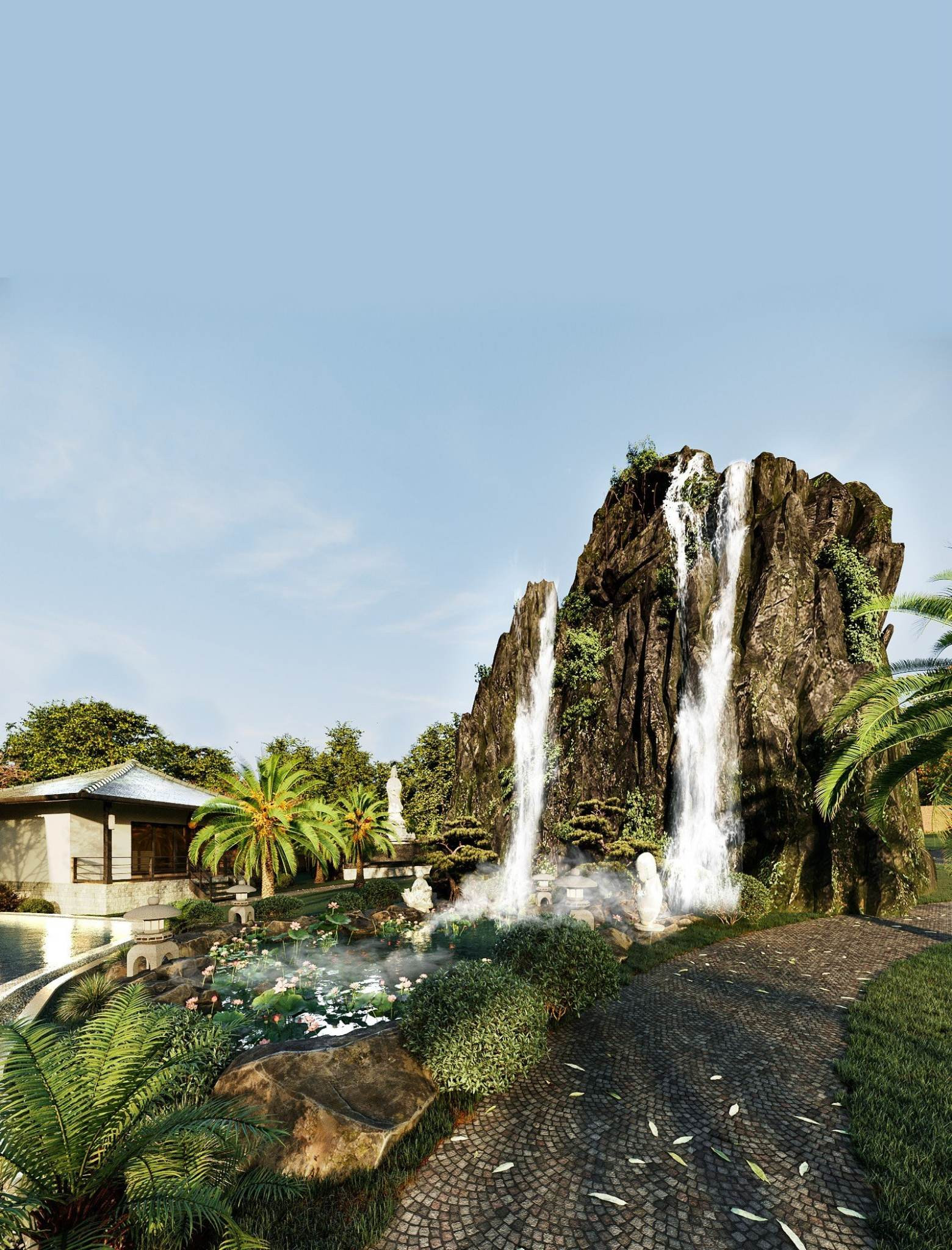 Thiên nhiên được mang vào không gian sống với thác nước nhân tạo, hồ sen nở rộ vào mỗi dịp tháng 5.
