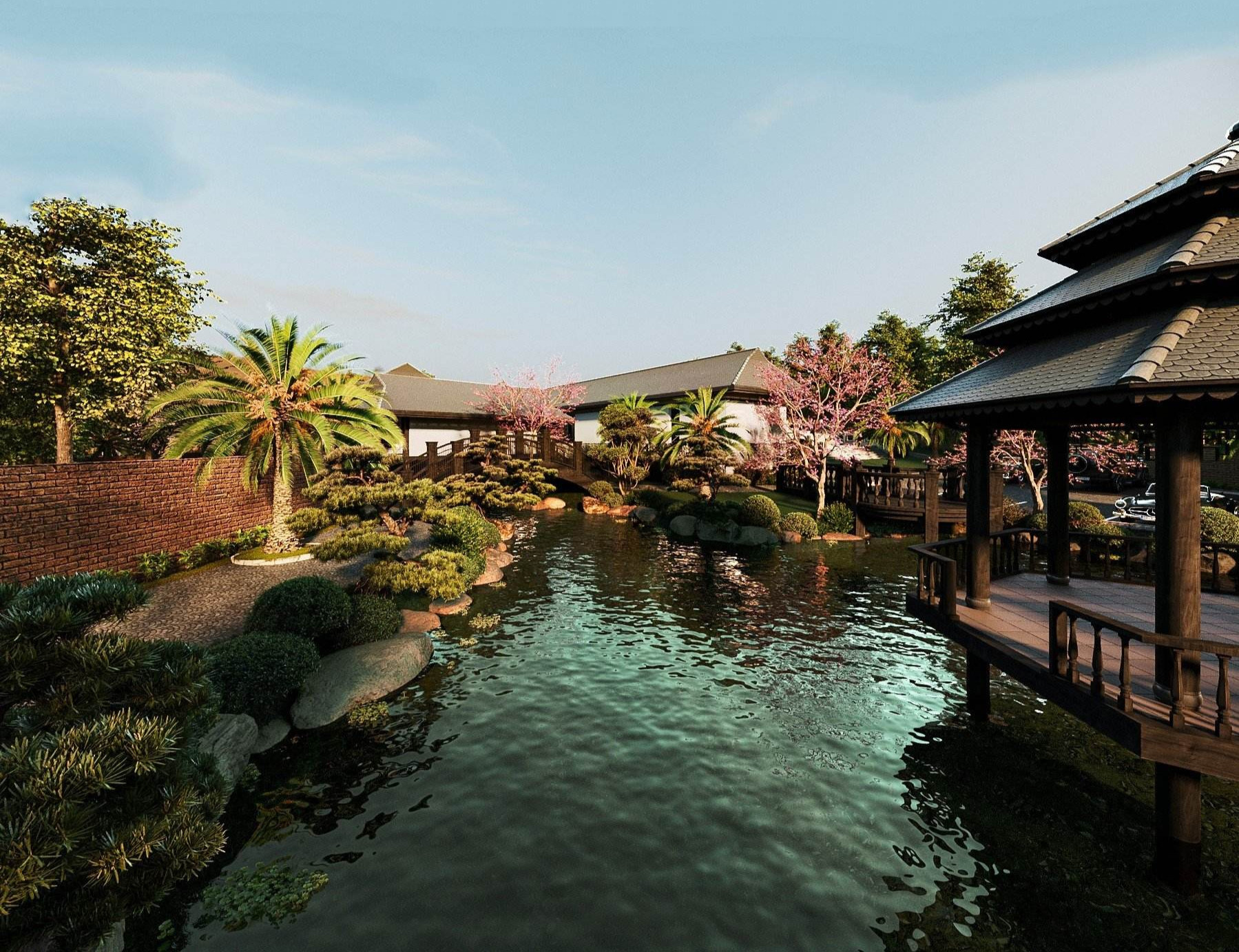 Hồ nước phong thủy trước nhà có tác dụng điều hòa không khí, mang ý nghĩa phong thủy và tạo cảnh quan đẹp mắt. Lầu lục giác giữa hồ phục vụ những bữa trà chiều mang phong cách hoài cổ.