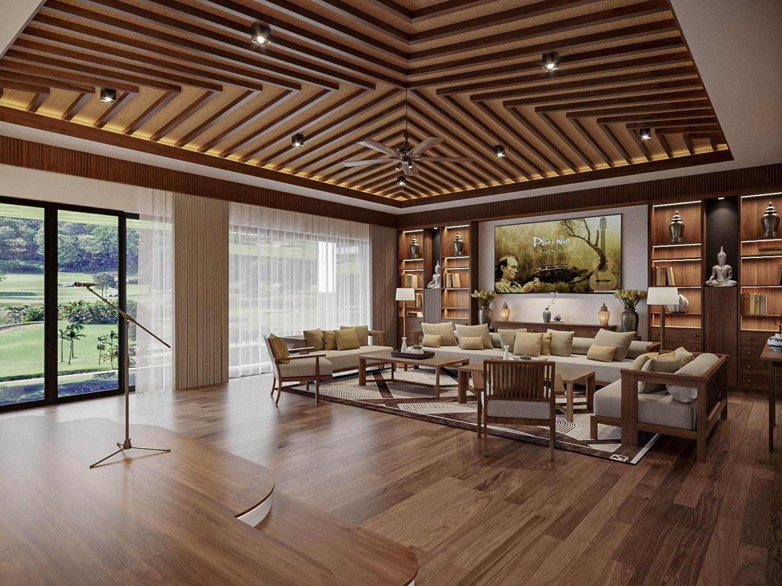 Khu vực trung tâm là phòng khách rộng kiêm chức năng giải trí, được lắp dàn âm thanh, sân khấu mini.