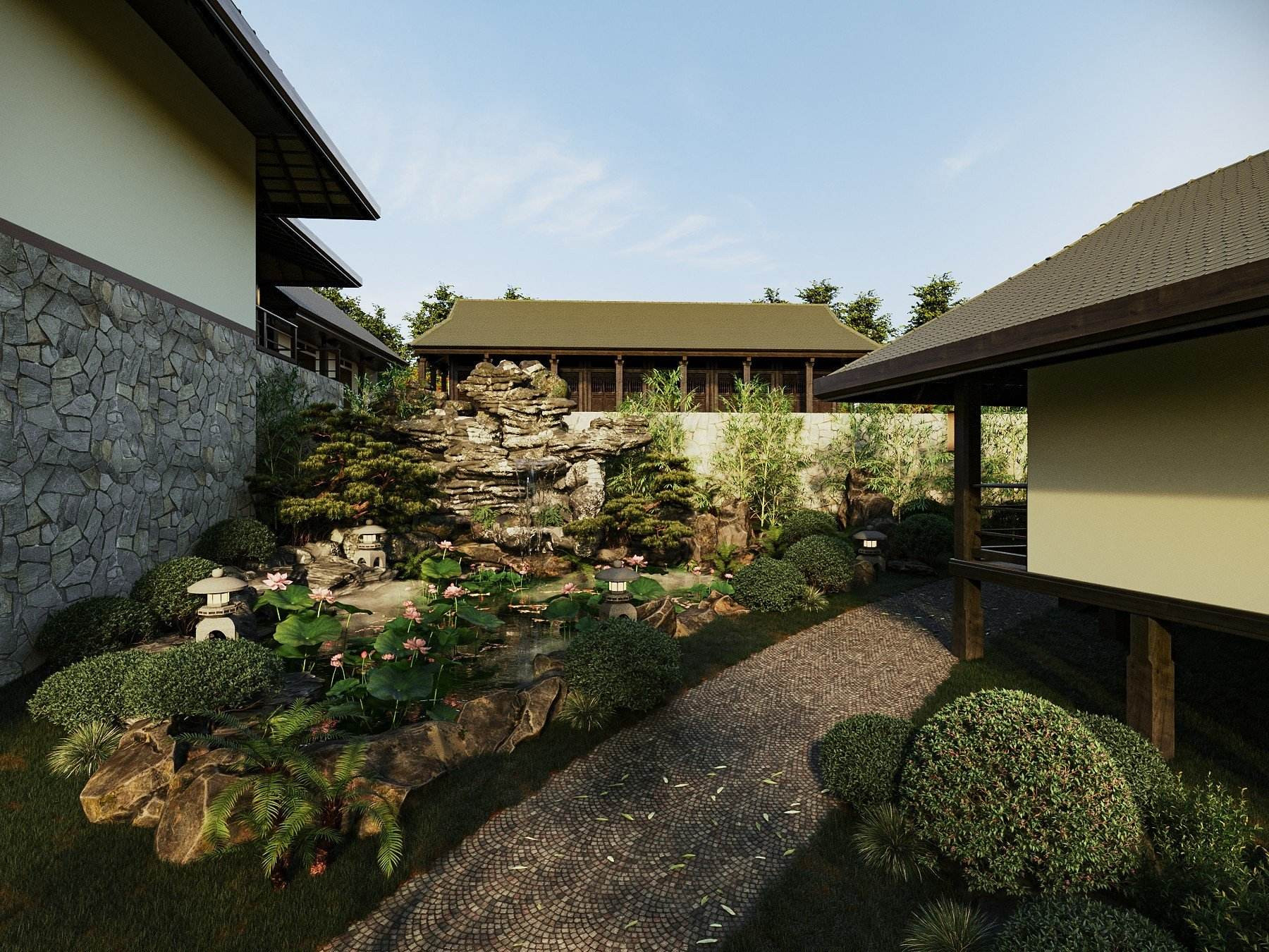 Những nếp nhà mái dốc phục vụ cho các nhu cầu chức năng khác nhau của gia đình. Lối dẫn vào các khu vực chức năng lát đá nhỏ, có khe nhám để dễ thoát nước và tránh trơn trượt.