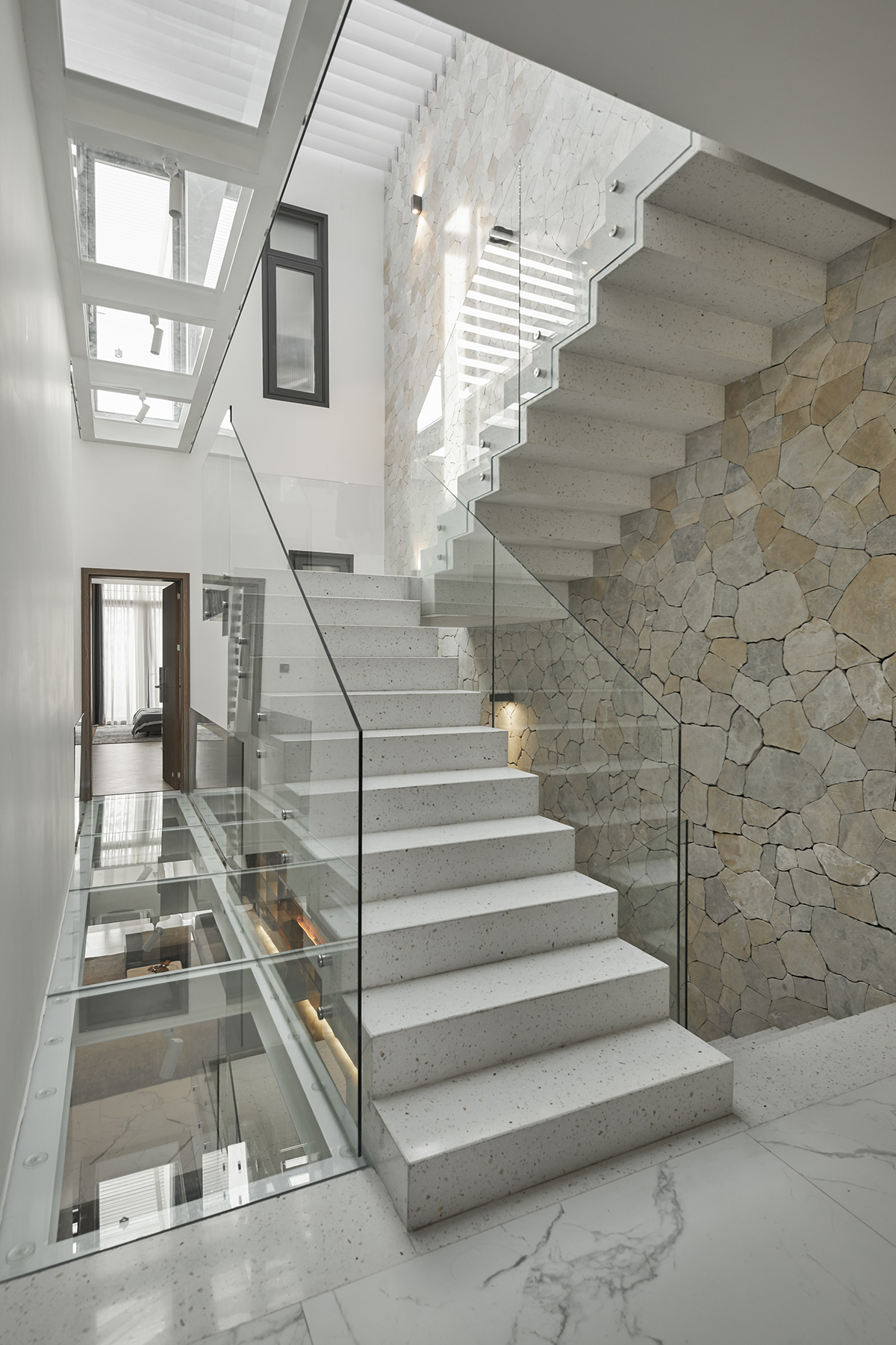 Cầu kính làm bằng kính cường lực nên có thể di chuyển bình thường phía trên. Ngoài tác dụng giao thông, cầu kính còn giúp đưa ánh sáng thiên nhiên từ giếng trời trên mái xuyên thấu xuống các phòng công năng phía dưới.