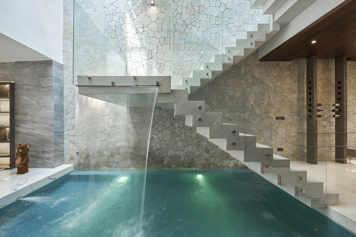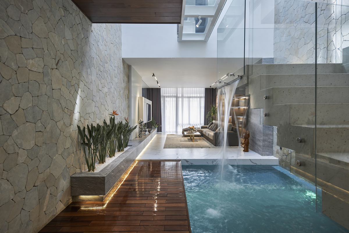Hồ bơi với thác nước ngay tầng trệt không chỉ giúp điều hòa, làm mát không khí mà còn làm cân bằng độ ẩm trong nhà.