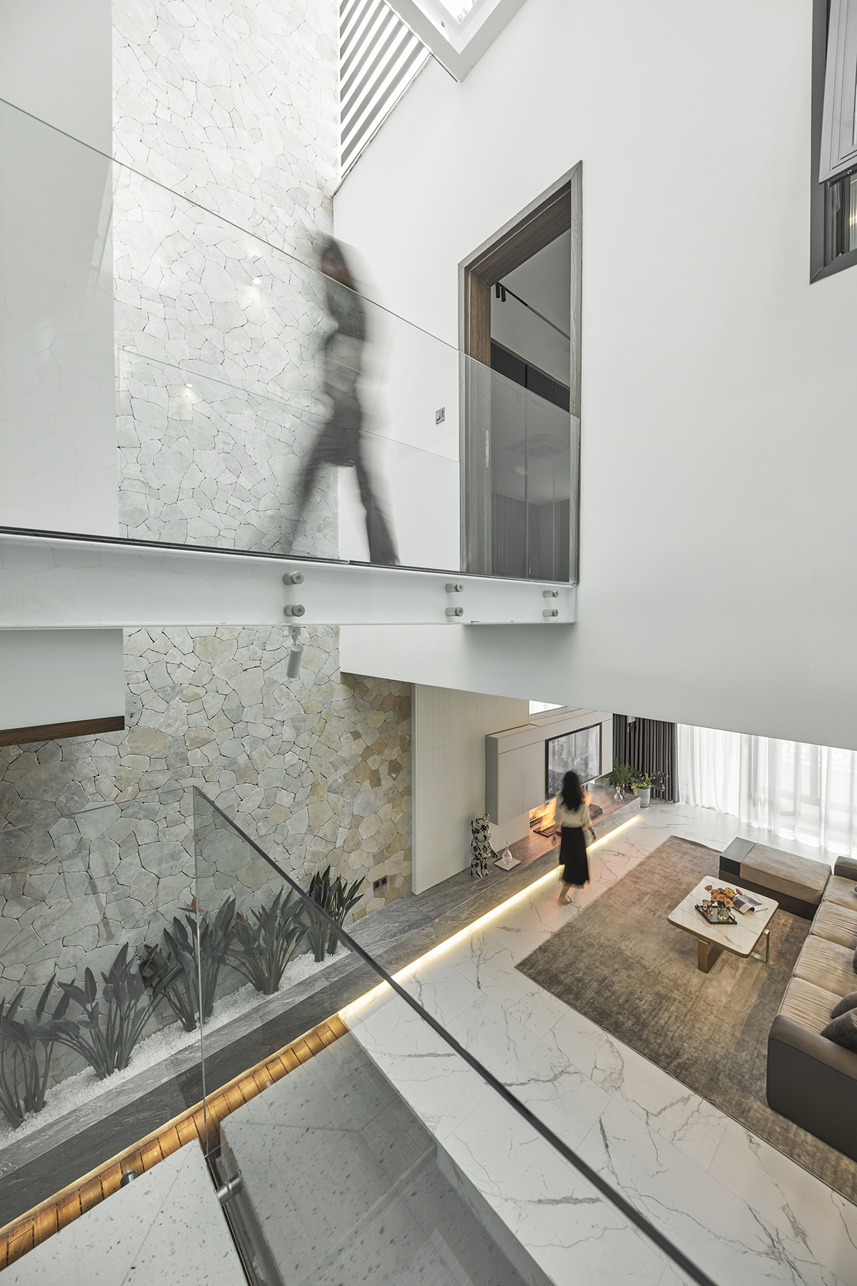 Từ khoảng thông tầng, ánh sáng từ giếng trời xuyên qua cầu kính xuống phòng khách, tạo cảm giác không gian rộng hơn khi tầm nhìn mở rộng theo chiều cao của thông tầng thay vì theo chiều ngang hẹp.