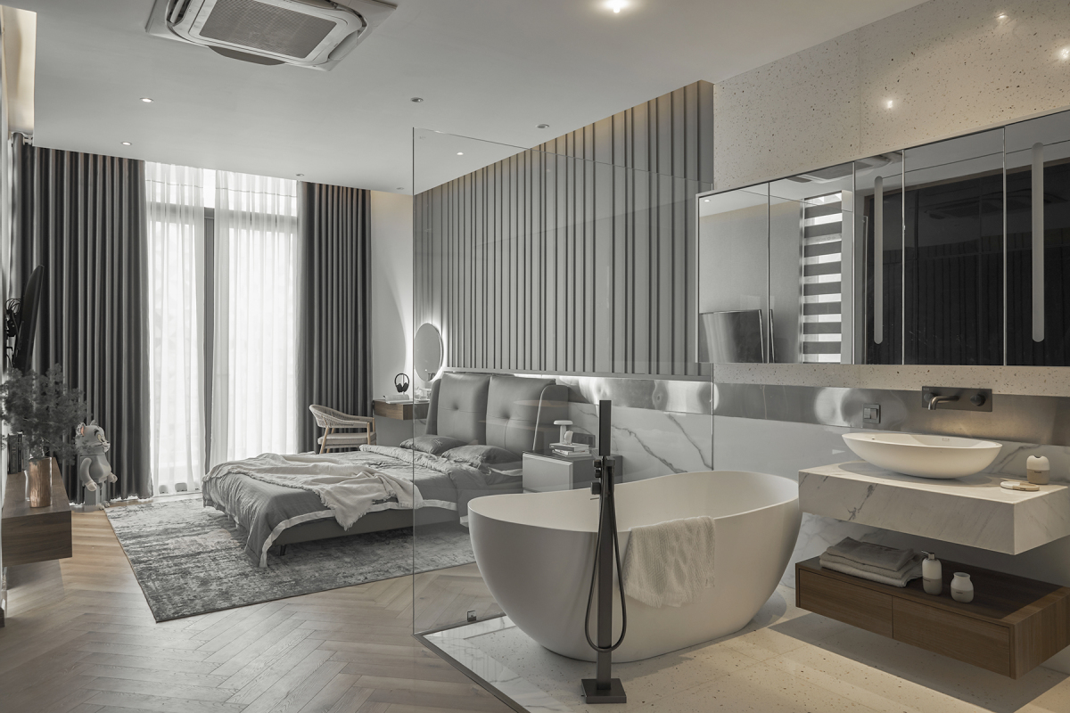 Phòng vệ sinh được thiết kế liền kề với phòng ngủ, sử dụng vách kích như một giải pháp chiếu sáng xuyên phòng. Cách thiết kế mở này giúp không gian rộng thoáng, lại tiện lợi trong sinh hoạt cho chủ nhà.
