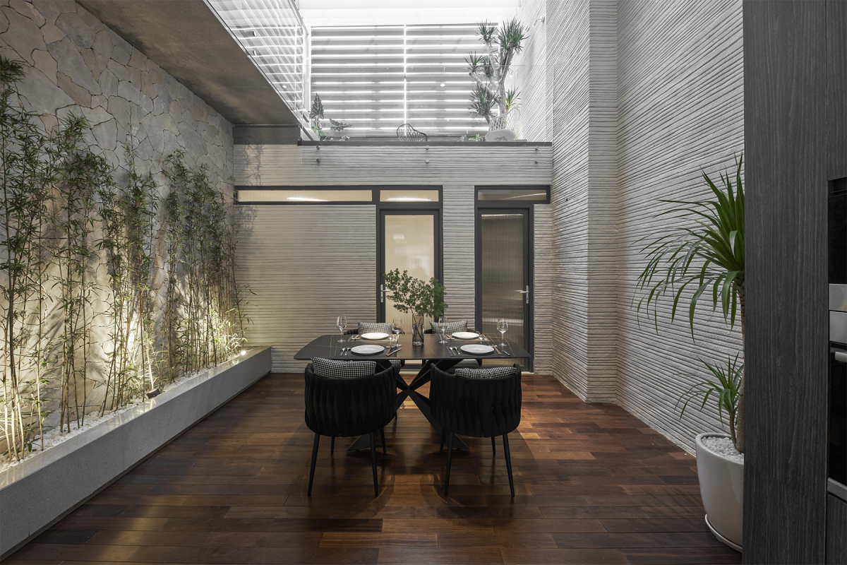 Khu vực bàn ăn ở tầng trệt với hệ vách kính lớn bao quanh và mái kính bên trên, được xem như không gian bán ngoài trời. Không gian này phù hợp khi chủ nhà làm tiệc nướng, khói sẽ thoát ra ngoài dễ dàng.