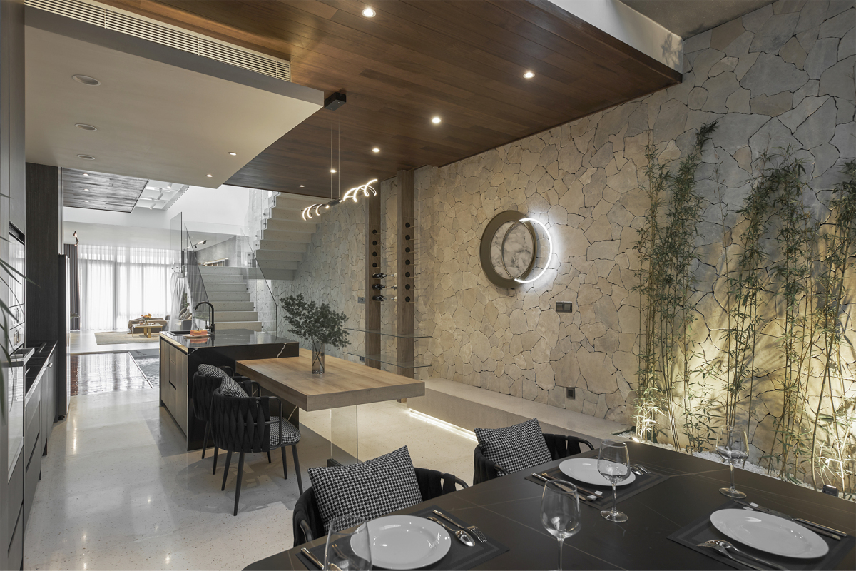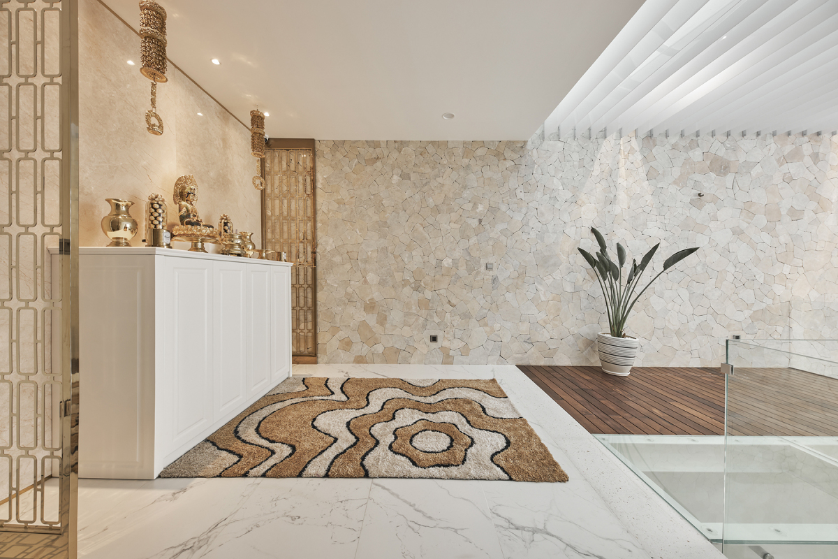 Tường đá rối kéo dài từ khu thông tầng cùa hồ bơi, bếp ăn lên đến mái lấy sáng và phòng thờ phía trên cùng. Sự xuất hiện của mảng tường đã hòa nhập được với khung cảnh thiên nhiên như thác nước, cây cối phía trong ngôi nhà.