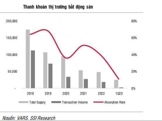 Trong báo cáo, SSI Research dẫn số liệu của VARS, cho biết tỷ lệ hấp thụ trong quý 1/2023 giảm xuống mức thấp kỷ lục 11%. Tổng số giao dịch bất động sản trong quý là 2.700 căn, giảm hơn 50% so với cùng kỳ. Nhu cầu thị trường vẫn còn trong trạng thái khiêm tốn khi người mua duy trì thái độ chờ xem, kỳ vọng vào việc giá và lãi suất mua nhà giảm thêm nữa.